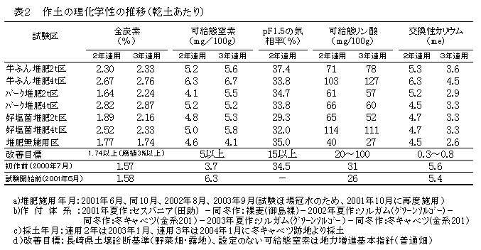 土壌中の可給態リン酸は、牛ふん堆肥4t/10a及び好塩菌堆肥4t/10aの2年連用で100mg/乾土100g以上にまで蓄積する。交換性カリウムは作付が進むにつれ減少するが、牛ふん堆肥4t/10aの連用では減少量が少ない(表2)。