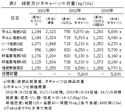 表3 緑肥及び冬キャベツの収量(kg/10a)