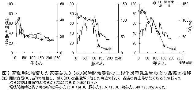 堆積期間における二酸化炭素発生量および堆積物の品温が切り返しを行っても大きく再上昇しなくなる時期はいずれの畜種においても同様である(図2)。このため、本装置での二酸化炭素発生量は堆肥中の易分解性有機物量を推定していると考える。