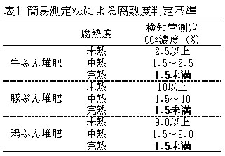 堆積過程での二酸化炭素発生量は畜種によって異なるため、腐熟程度を評価するには、堆肥の原材料を考慮し、堆肥化がほとんど進んでいないものを未熟、堆肥化がそれ以上進まないもの(二酸化炭素の発生量が安定した状態)を完熟、途中過程を中熟として畜種別の基準を設定する(表1)。