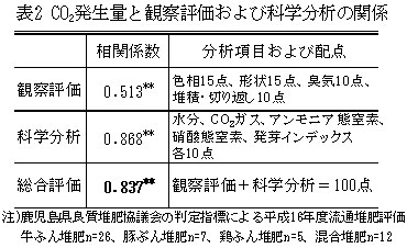 鹿児島県堆肥コンクール(鹿児島県良質堆肥協議会主催)における総合評価(化学分析、形状、臭気など)と二酸化炭素発生量による評価は概ね一致する(表2)。