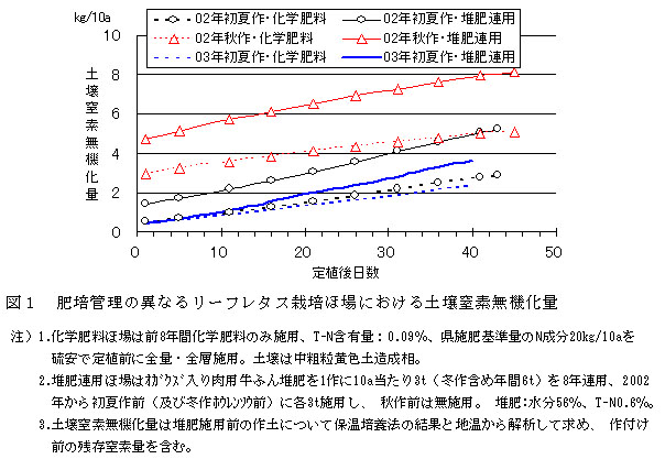 そこで、施肥窒素量が比較的多いリーフレタス栽培において、土壌や施用した堆肥からの窒素供給量を明らかにし、牛ふん堆肥を長期連用したほ場における施肥窒素削減率を作型別に検討する。