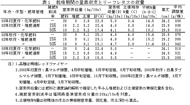 表1 栽培期間の窒素収支とリーフレタスの収量