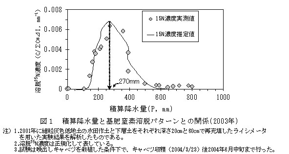 基肥窒素は積算降水量150mm付近で地表下80cmに到達し、浸透水の基肥由来の窒素濃度は積算降水量270mmの時に最高となる。この時点までに全体の40%程度が溶脱し、その割合は基肥窒素施用量の5%程度に相当する(図1、表1)。