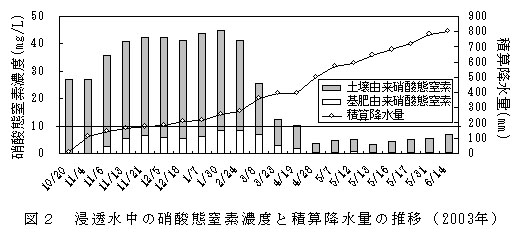 図2 浸透水中の硝酸態窒素濃度と積算降水量の推移(2003年)