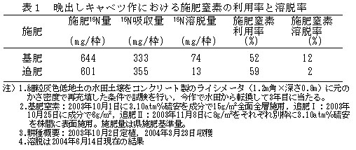 表1 晩出しキャベツ作における施肥窒素の利用率と溶脱率