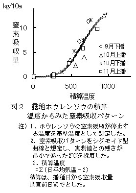 露地栽培のホウレンソウでは、播種期により収穫までに要する生育日数が異なるため、生育日数に対する窒素吸収パターンは異なる(図1)。しかし、播種後の有効積算温度(基準温度摂氏2度、以下同じ)に対しては、播種期の違いにかかわらず、同様の窒素吸収パターンを示す(図2)。