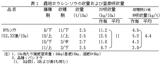 - 露地ホウレンソウの窒素吸収量は、播種後の有効積算温度(基準温度摂氏2度)により推定でき、収穫期の有効積算温度(摂氏800〜900度)における窒素吸収量は、10〜12kg/10aである。有効積算温度摂氏250度までの窒素吸収量は、極めて少ない。
