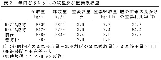 表2 年内どりレタスの収量及び窒素吸収量