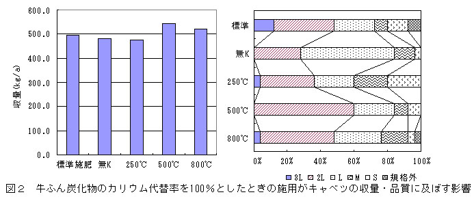 図2 牛ふん炭化物のカリウム代替率を100%としたときの施用がキャベツの収量・品質に及ぼす影響