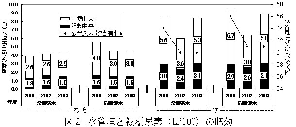 地力の違いは、わら、籾が吸収する施肥窒素の利用率に影響を与えない。わらへの施肥窒素の吸収量は施肥量を減らすと減少するが、地力差に影響されない。籾への施肥窒素の吸収量は地力差をある程度反映するが、土壌由来の窒素吸収量が地力の違いにより大きく変動するのに比べて影響が少ない(図3)。