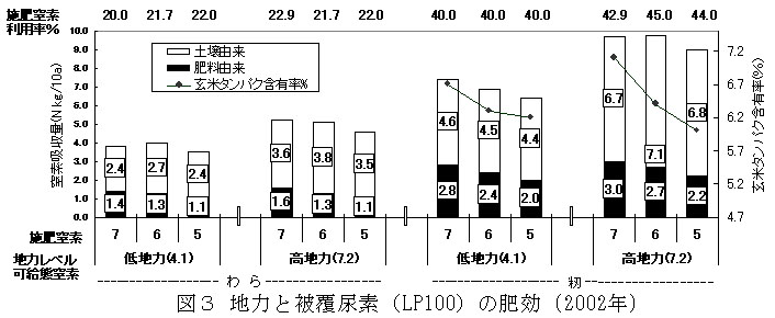 図3 地力と被覆尿素(LP100)の肥効(2002年)
