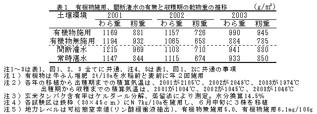試験期間中の水稲の生育は、2001年(畑より転換)は乾土効果と高温条件によりわら、籾重ともに多く、2002年は高温少雨と台風によりもみ重が少なく、2003年は期間を通じて降雨が多く生育前半が過去2年間より低温で推移し籾/わら比が高い。籾重で見ると有機物施用の効果は2年目から、間断潅水の効果は初年度から見られる(表1)。