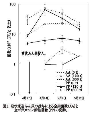 - 液状家畜ふん尿連用土壌のペプトンーポリミキシン培地で計数される菌群は液状家畜ふん尿(600t/ha年)投入直後に増加し、液状家畜ふん尿から持ち込まれた動物由来の非土壌性細菌、病原性細菌、糞便性大腸菌群を含み2ヶ月間は土壌中に生存している。