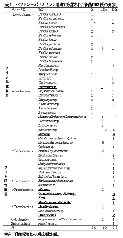 表1 ペプトンーポリミキシン培地で分離された細菌(152株)の分類