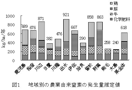 農業由来窒素発生量は地域間差がみられ、最も少なかった大島地域(240kg/ha/年)と最も多かった出水地域(921kg/ha/年)では約4倍の差がみられる(図1)。