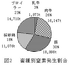 県全体における畜種別の窒素発生量は、採卵鶏およびブロイラーの合計となる鶏からの発生量が25,786tで最も多く、全体の発生量の41%を占めると推定される(図2)。2番目は豚の18,998tで全体の30%を占める。