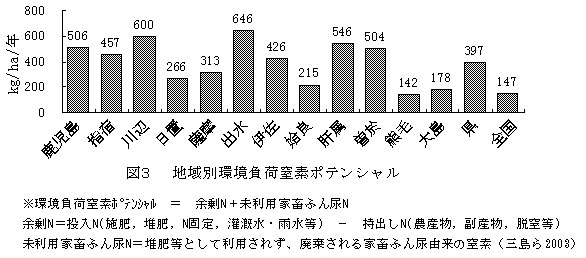 養分収支システム(三島ら2003)による本県耕地における環境負荷窒素ポテンシャル(余剰N(投入N量-持出しN量)+未利用家畜ふん尿N量)は、県全体で52,544t/年、単位耕地面積当たりで397kg/haとなり、全国平均の約2.5倍と推定される(図3)。また、環境負荷窒素ポテンシャルは、家畜ふん尿由来窒素発生量が多い地域で高い(図1、図3)。