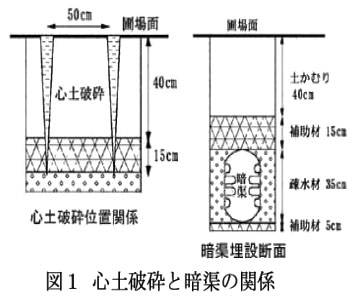 暗渠埋設深は心土破砕時に疎水材を通して連結可能な位置に設置する。
