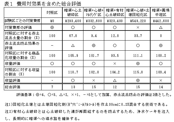 暗渠と心土破砕とほ場平坦の組合せでは表土流出がないので、図2に示してないが、暗渠を倍密とし、内部排水を強化したため、湿害回避と赤土流出「ゼロ」をめざすことが可能である(表1)。