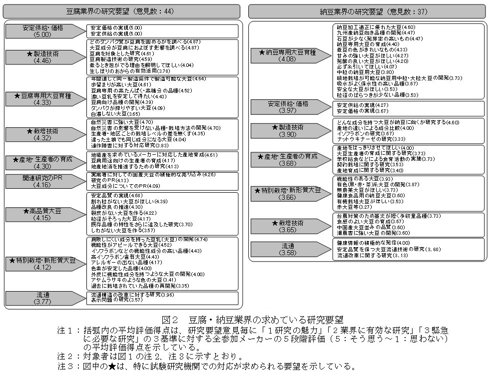 豆腐・納豆メーカーの求めている要望として、豆腐では、「製造技術に関する研究」「豆腐専用大豆の育種」「栽培技術に関する研究」「産地・生産者育成」「高品質大豆育種」に、納豆では「納豆専用大豆の育種」「納豆製造技術に関する研究」「特別栽培・新形質大豆育種」に高い評価を与えており、研究機関が対応すべき要望が多い(図2)。