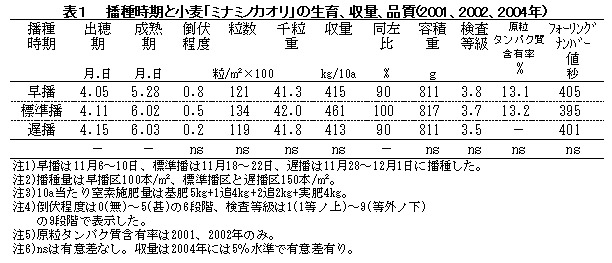 表1 播種時期と小麦「ミナミノカオリ」の生育、収量、品質(2001、2002、2004年)