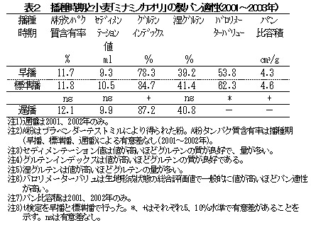 表2 播種時期と小麦「ミナミノカオリ」の製パン適性(2001〜2003年)
