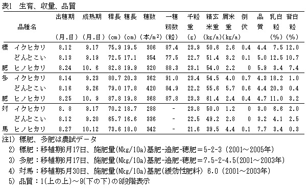 多肥栽培で増収するが、乳白粒の発生が多くなるので、極端な多肥栽培は避ける。