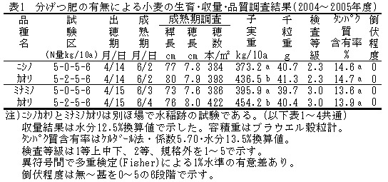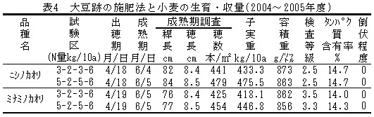 表4 大豆跡の施肥法と小麦の生育・収量(2004〜2005年度)
