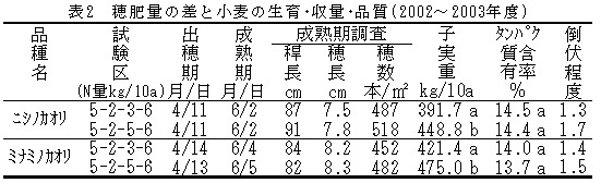 表2 穂肥量の差と小麦の生育・収量・品質(2002〜2003年度)