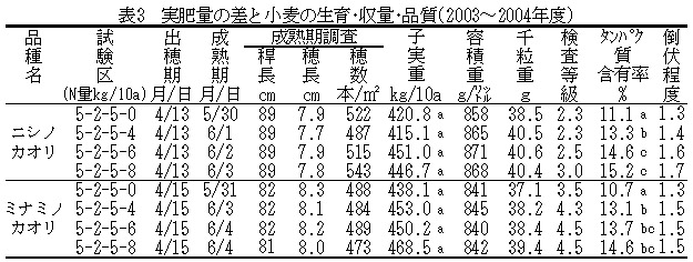 表3 実肥量の差と小麦の生育・収量・品質(2003〜2004年度)