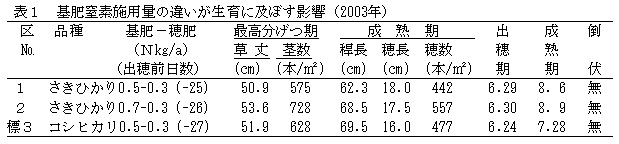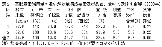 表2 基肥窒素施用量の違いが収量構成要素及び品質、食味に及ぼす影響(2003年)