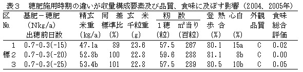 表3 穂肥施用時期の違いが収量構成要素及び品質、食味に及ぼす影響(2004、2005年)