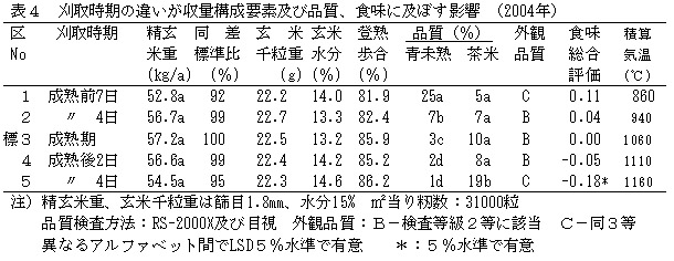 表4 刈取時期の違いが収量構成要素及び品質、食味に及ぼす影響(2004年)