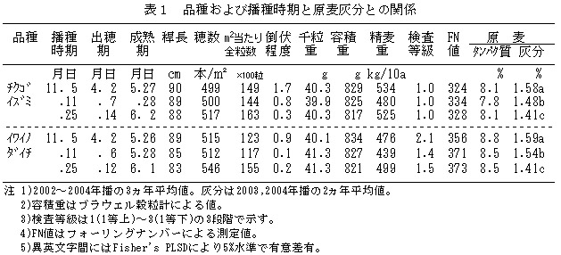 小麦原麦の灰分は播種時期による差が大きく、早播の11月5日播では灰分は高く、適期播の11月25日播では低い(表1)。
