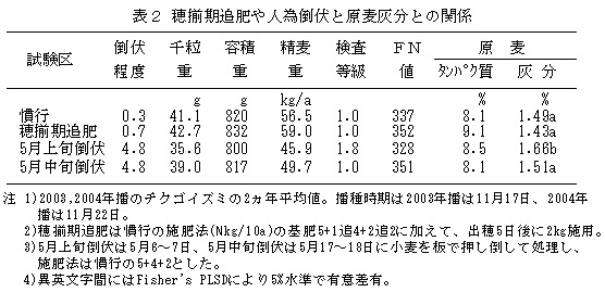 表2 穂揃期追肥や人為倒伏と原麦灰分との関係