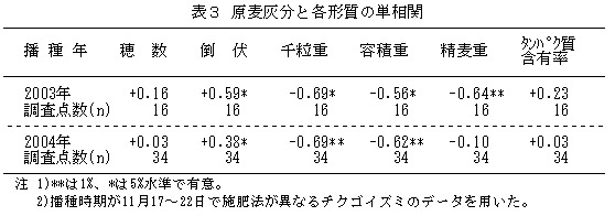 播種時期が11月17〜22日の適期播の場合、灰分は千粒重や容積重と負の相関が高く、千粒重や容積重が重いほど、灰分が低下する(表3)。