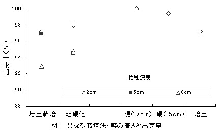 畦表面硬化法の出芽率は、畦の高さに左右されず、標準(培土)栽培法に比較しても大きな差はなく、90%以上確保できる(図1)。