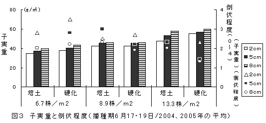 畦表面硬化法の単位面積当たりの子実重は、播種深度を5〜8cm、播種密度が8.9〜13.3株/m2とするほど、また、培土を行う標準栽培法より重くなる傾向にある(図3)