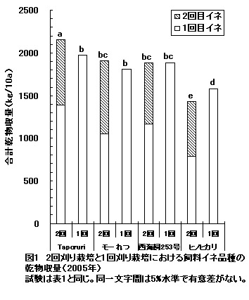 図1 2回刈り栽培と1回刈り栽培における飼料イネ品種の乾物収量(2005年)