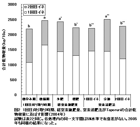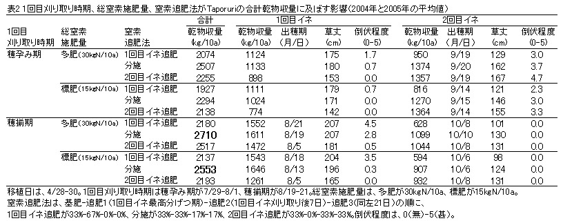 表2 1回目刈り取り時期、総窒素施肥量、窒素追肥法がTaporuriの合計乾物収量に及ぼす影響(2004年と2005年の平均値)