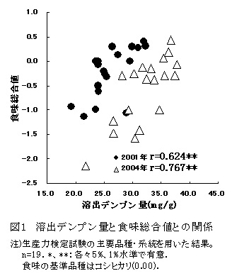 熱水処理(摂氏85度)後の溶出デンプン量は、アミロース含有率やテクスチャー特性値と同様に炊飯米の食味総合値と2カ年ともに高い関係を示す(表1、図1)ことから、食味の良否を評価することが可能である。