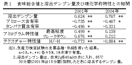 表1 食味総合値と溶出デンプン量及び理化学的特性との相関