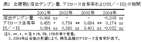 表2 出穂期と溶出デンプン量、アミロース含有率およびH/-hとの相関