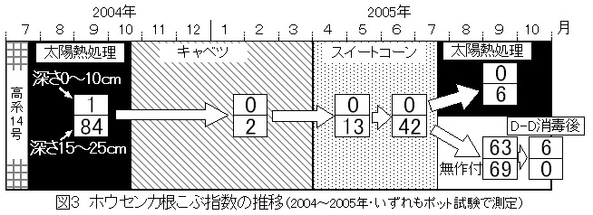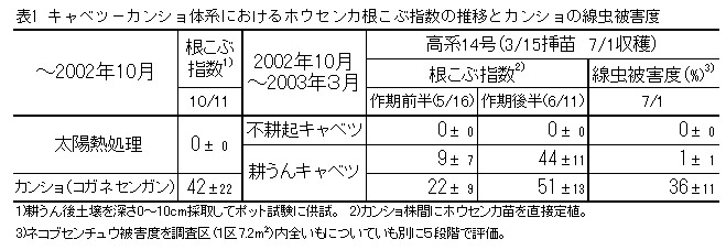 表1 キャベツーカンショ体系におけるホウセンカ根こぶ指数の推移とカンショの線虫被害度