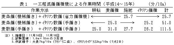 表1 一工程混播播種機による作業時間(平成14〜15年)(分/10a)