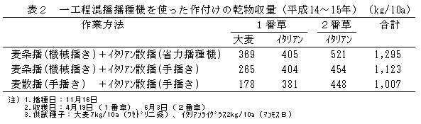 表2 一工程混播播種機を使った作付けの乾物収量(平成14〜15年)(kg/10a)