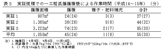 表3 実証規模での一工程混播播種機による作業時間(平成14〜15年)(分)