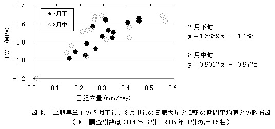 図3 「上野早生」の7月下旬、8月中旬の日肥大量とLWPの期間平均値との散布図