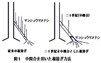 - ニホンナシ「幸水」に根接ぎを行う場合、「マンシュウマメナシ」台木を直接根接ぎするよりも「二十世紀」を中間台としたものを根接ぎする方が活着率も高く、その後の台木の生育も優れる。